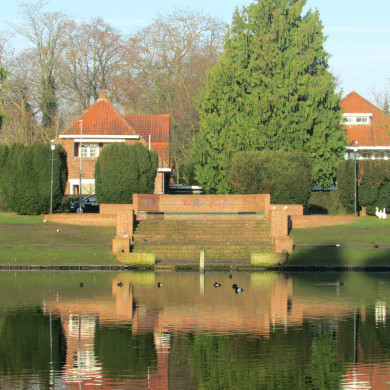 Aan de noordwestzijde aangelegde, viervoudige terraspartij met in plastisch en gevarieerd verband gemetselde muurtjes en aansluitende gemetselde bloembakken, die steeds de hoogteverschillen markeren te weerszijden van de lange, vijf, respectievelijk zes treden tellende, gemetselde stoepen. Bovenaan het doorlopende pad een uitzichtsbank, geintegreerd in een op decoratieve wijze volgens verschillende verbanden gemetselde muur met tandlijsten en staande rollagen op een langgerekte U-vormige grondslag.