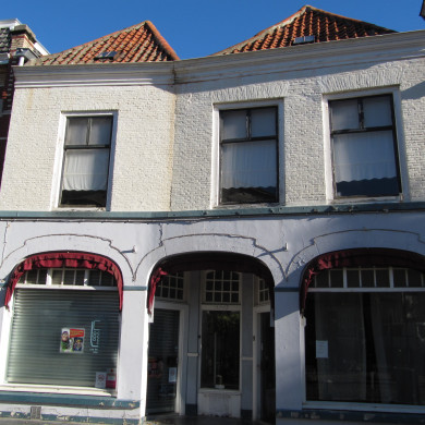 Twee HUIZEN met geverfde, vernieuwde lijstgevel XVIII-XIX, gecombineerd tot een winkelpand.