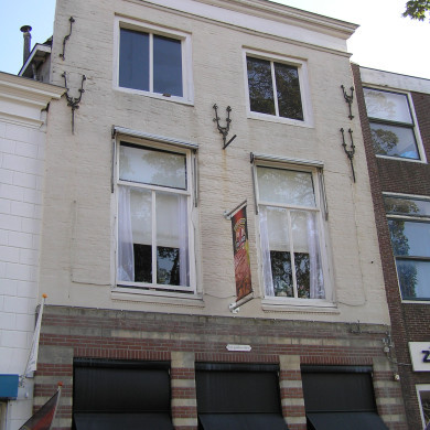 Huis met lijstgevel oorspronkelijk XVI, kroonlijst XVIII. Speklagen en sierankers. Winkelpui.