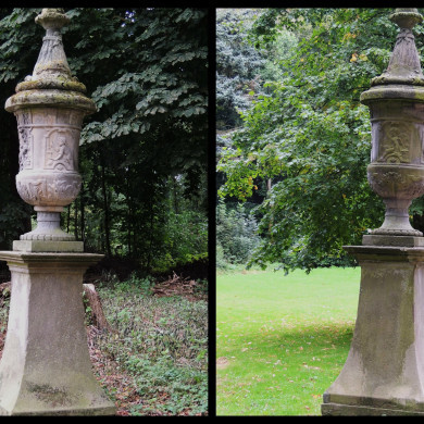 TWEE HARDSTENEN VAZEN OP SOKKELS aan het voorplein. Twee slanke natuurstenen tuinvazen met hoge, oorspronkelijk vermoedelijk niet bijbehorende deksels, waarschijnlijk uit de 19e eeuw daterend, op het voorplein ter weerszijden van de balustrades van de toegangsbrug. Op de kelk van de vazen cartouches met putti met attributen, die mogelijk de seizoenen en de dag en de nacht voorstellen. De vazen, die vrijwel identiek zijn aan een vaas op Vijversburg (Tietjerk), zijn geplaatst op twee door een geprofileerde plaat afgedekte hardstenen sokkels, die zich naar boven toe boogsgewijs verjongen.