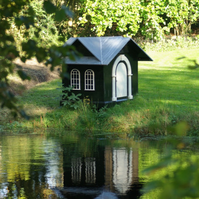 EENDENHOK. Bij het noordelijk bouwhuis opgestelde 19e-eeuwse eendenhok, dat oorspronkelijk wellicht in een der vijvers in landschapsstijl van de historische tuin- en parkaanleg was opgesteld. Groen geschilderd houten hok van 1 verdieping op rechthoekig grondplan onder een samengesteld dak van twee kruislings geplaatste zadeldaken. Midden in de zuidoost gevel een rondboogdeur waaromheen rondboogprofiel. Aan elk van de twee smalle (zuidwest- en noordoost-) gevels twee rondboogvensters met gebogen roedenverdeling, die gelijkenis vertoont met die van de vensters van de bijgebouwen. Op begane grondniveau van de brede noordwestgevel twee vensters met 4-ruitsindeling. Op eerste verdieping niveau een venster met 2-ruitsindeling.