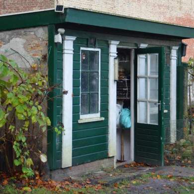 VOLIERE. Aan de zuidoosthoek van het zuidelijk bouwhuis geplaatste 19e-eeuwse voliere onder lessenaarsdak, met de voorzijde naar het oosten gericht. Centraal gelegen in de groen geschilderde houten door vier gebroken wit geschilderde pilasters gelede en omlijste voorgevel een enkele draaideur met venster met 6-ruitsindeling met ter weerszijden twee vensters met 6-ruitsindeling. De achterwand en de zijkanten van de voliere is in gele baksteen opgetrokken.