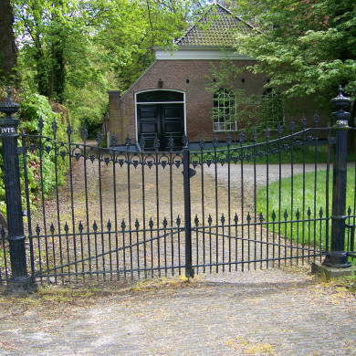 SMEEDIJZEREN HEKWERK MET TWEE INRIJHEKKEN. Aan de westzijde van de historische aanleg gelegen 19e-eeuws smeedijzeren hekwerk met twee inrijhekken, waarvan de een recht tegenover de ingangspartij van het huis en de ander tegenover de schuur is gesitueerd. De situering van de inrijhekken op deze plaats is vermoedelijk vanouds; de kaart van de stad Assen uit 1809 door P.A.C. Buwama Aardenburg geeft op deze plaatsen de ingang naar de buitenplaats aan. De inrijhekken zijn samengesteld uit een dubbel hek, waarvan het profiel zich naar het midden boogsgewijs verjongd, geflankeerd door ronde met vaasvormig motief bekroonde gecanneleerde pijlers. Aan weerszijden een vleugelstuk, waarvan het profiel zich naar de buitenzijde boogsgewijs verjongt, met aan de buitenzijden een identieke, maar lagere, pijler. Aan weerszijden van laatstgenoemde pijlers een naar het oosten afbuigend zijstuk met identiek boogsgewijs verjongend profiel. Hekwerk en inrijhek met vleugel- en zijstukken zijn samengesteld uit regels en spijlen met ornamentele pijlpuntvormige bekroning.