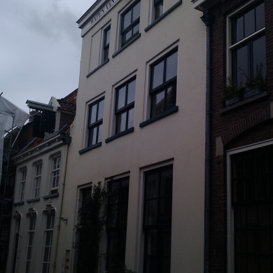 Diep PAND (XVII ?) onder hoog, omlopend schilddak, dat aan de westzijde wordt afgesloten door een puntgevel. Voorgevel verbouwd XIX. De achtergevel staat op de stadsmuur. Aan de oostzijde twee oude schuren onder mooie schilddaken.