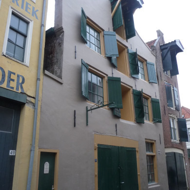 Gepleisterde tuitgevel van pakhuis (XVII ?). Hijsbalk met overstek. Oude luiken.