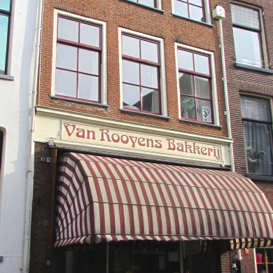 Pand met trapgevel (1614) met geprofileerde waterlijst onder de top, geprofileerde dakplaten, makelaar op gebeeldhouwd kopje en als bekroning een schildhoudende leeuw. In de vensters een roedenverdeling ca.1800. Muurankers. Boven de moderne pui in jaartalankers de cijfers 1 en 4.
