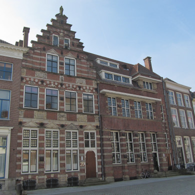 PAND met bakstenen trapgevel met rijke, natuurstenen decoratie. De verdiepingen, gescheiden door brede friezen met cartouches, maskerkoppen en gevelstenen tussen geprofileerde waterlijsten, hebben afwisselend driehoekige frontons met schelpvullingen en geblokte ontlastingsbogen met engelenkopjes boven de, door pilasters met bewerkte blokken en Toscaanse en Jonische kapitelen gescheiden vensters. De zolderverdiepingen worden versierd door bewerkte natuurstenen banden. Tussen de twee smalle vensters met middendorpels in de bovenste zolderverdieping een borstbeeld en op de top, in het gebroken fronton, een allegorische vrouwenfiguur. Pui sterk gerestaureerd, overigens Empire-ramen. Boven de pui een alliantiewapen (afgekapt); in de rechter cartouche boven de pui het jaartal: 1615. Muurankers.