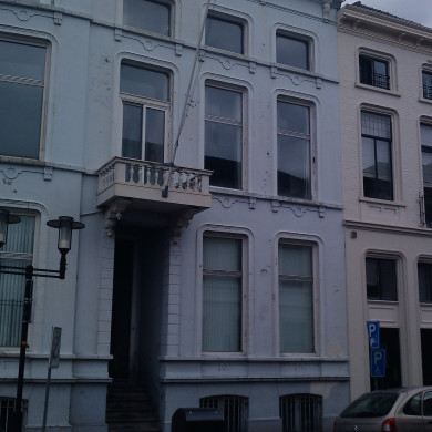 Pand met geverfde lijstgevel (XIXc) met erker op consoles.