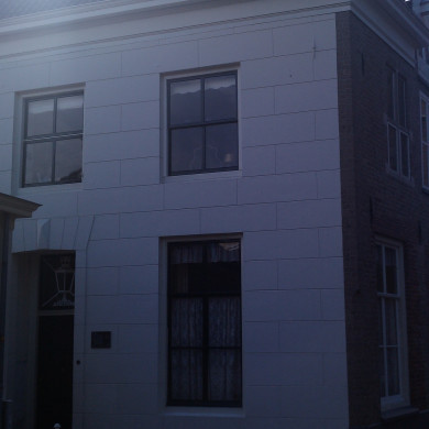HUIS (XVI ?) onder hoog schilddak, waarin twee dakkapellen met driehoekige frontons. Gemoderniseerd ca.1800 met gepleisterde lijstgevels, deuromlijsting met pilasters en fries van triglyphen en metopen en gesneden deuren met bovenlicht. Empire-ramen. Boven de zijgevel een dakkapel met hijsbalk.