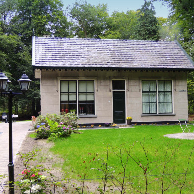 TUINMANSWONING. Een verdieping hoge aan de westzijde van de oprijlaan gelegen tuinmanswoning op rechthoekig dwarse plattegrond onder een met blauwe Friese golfpannen gedekt zadeldak waarlangs ornamentele daklijst, uit ca. 1900. De gevels zijn grijs gepleisterd en voorzien van een blokmotief. Voor(zuid-)gevel is in drie traveeën geleed. Centraal gelegen de ingangspartij, bestaande uit een deur met gedeeld bovenlicht, dat aan de bovenzijde en omgaand tot halverwege de zijkanten met een sierprofiel waarin in het midden een rocaille-achtige kuif is omlijst. Ter weerszijden twee vensters van recente datum, gevat in de oorspronkelijke kozijnen, die met een aan de ingangspartij identiek profiel worden omlijst. Aan de oostgevel op beganegrond-niveau een kozijn met blind venster omlijst met een aan de voorgevel identiek profiel. Op eerste-verdieping-niveau twee kleine vensters met diagonale roedenverdeling ter weerszijden van een iets groter rechthoekig blind veld.