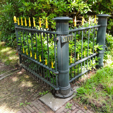 OOSTELIJK TOEGANGSHEK. Gietijzeren dubbel draaihek bij de ten oosten van het hoofdgebouw gelegen oprijlaan met van pijlvormige bekroning voorziene tralies, die aan beide zijden geflankeerd worden door gietijzeren gecanneleerde pijlers, waartegen aan de buitenzijden twee rechthoekige zijstukken met identieke tralies. Aan weerszijden van de buitenste pijlers voluutvormige vleugelstukken met krulwerk. Het toegangshek, dat uit de tweede helft van de 19e eeuw dateert, is het oostelijke pendant van het toegangshek, dat aan de ten westen van het hoofdgebouw gelegen oprit is gesitueerd.