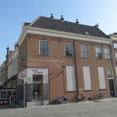 Hoekpand Zaadmarkt. Diep pand met schilddak, waarin dakkapel met fronton en vleugelstukken. Geverfde gevels onder rechte lijsten (XIX b).