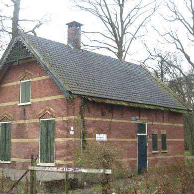 PORTIERSWONING. Bij de toegangsbrug gelegen, deels onderkelderd, een verdieping hoog, op rechthoekige grondplan, opgetrokken in rode en gele baksteen, onder zadeldak met fraaie en rijk bewerkte windveren en gootlijsten in 'chaletstijl'.