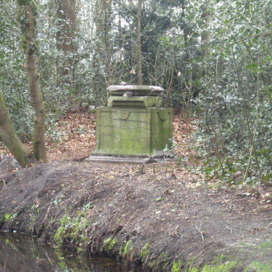 Hardstenen Lodewijk XVI POSTAMENT uit de 18e eeuw aan de gebogen zuidwestoever van de vijver in landschapsstijl.