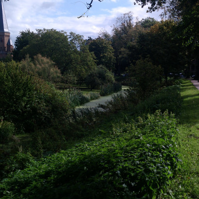 Tuinen, begrensd aan de noordzijde door de stadsmuur en aan de zuidzijde door het water van de binnengracht.