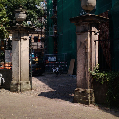 Hoekpand (XVI ?) op, in Zutphen meermalen voorkomende driehoekige plattegrond op het punt, waar Oude Wand en Armenhage samenkomen. De smalle zijde heeft een afgeknotte puntgevel met top-sieranker. Gepleisterde gevels. In het dak dakkapel met fronton en hijsbalk.