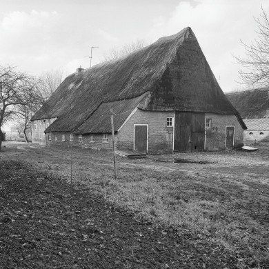 19e eeuwse uit baksteen opgetrokken BOERDERIJ van het middenlangsdeeltype, onder aan achterzijde afgewolfd rieten schilddak met topschoorsteen.
