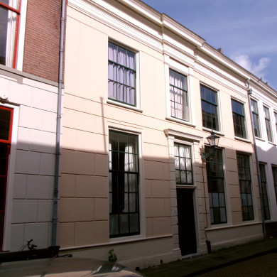 Pand met gepleisterde gevel en rechte lijst. Voordeur en bovenlicht in pilasteromlijsting plm 1800.