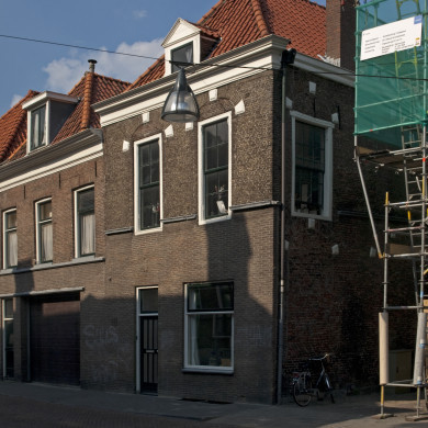 Hoek Papenstraat (behoort bij Cele-complex). Voormalige stalhouderij. Gepleisterde lijstgevel met verhoogd middengedeelte met halfronde beëindiging. Verdiepingsramen met flauw getoogde bovendorpels. Begane grond met garagepui. In de gevel drie paardenkoppen. plm XIX B.