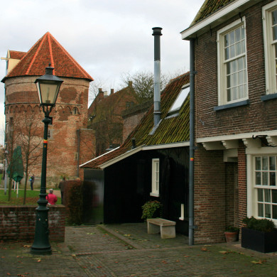Pand met overkraagde verdieping, aangebouwd tegen de buitenkant van de stadsmuur.