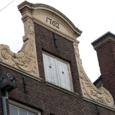 Pand met halsgevel met gebeeldhouwde vleugelstukken en fronton, Lod. XIV. In de top gedateerd 1738. Hijsbalk XVIIId. Onderpui modern.