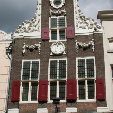 Pand met halsgevel met doorgaande pilasters. Rijk gebeeldhouwde vleugelstukken, festoenen, oeil-de-boeuf. Onder het fronton gedateerd 1667. Onderpui modern.