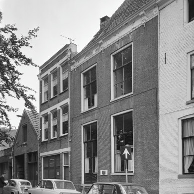 Pand met bakstenen gevel op hardstenen sokkel. Kroonlijst met consoles. XIX.