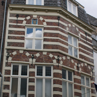 HOEKPAND met rechte lijstgevels. XVIII B. Moderne onderpuien.