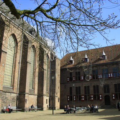 Zogenaamd Karel V huis met rijke renaissance gevel met ruime toepassing van zandsteen. De steeds door gebosseerde pilasters gelede verdiepingen worden onderling gescheiden door friezen met leeuwenmaskers, arabesken, stierschedels en offerschalen.