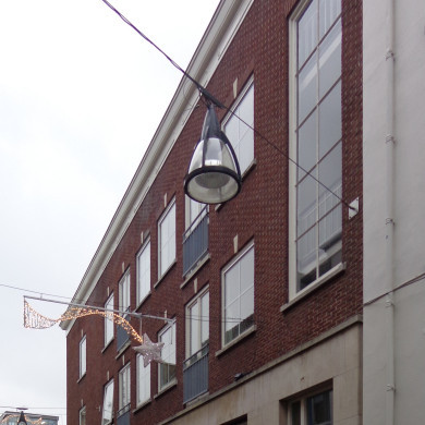 Hoekpand met verdieping en schilddak, dat aan de achterzijde aansluit tegen een puntgevel van laat-middeleeuwse oorsprong, die waarschijnlijk de achtergevel van een ander pand is geweest. In deze gevel overblijfselen van vensters met bakstenen omlijstingen, en natuurstenen kalven en lateien.