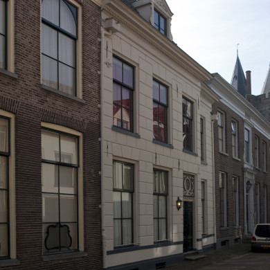 Breed pand met gevel met rechte kroonlijst. Omlijste middenpartij plm 1840.