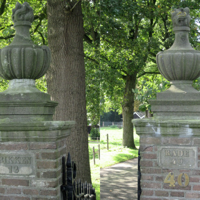 Hekpijlers Bikkenrade. Gemetselde vierkante bakstenen hekpijlers met geprofileerde natuurstenen dekplaten, bekroond door siervazen. Jaartalstenen 1842.
