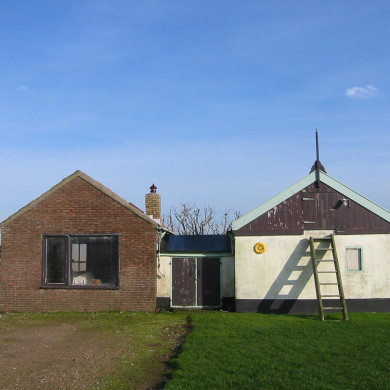 Landelijke 19e eeuwse WONING zonder verdieping onder zadeldak tussen topgevels. Ingang in het midden; smalle vensters in de zijgevels. Toegangshek.