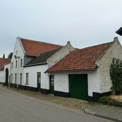 Hoeve van mergel om open binnenplaats met aan de straat een gevel, 1671, met resten van een in- en uitgezwenkte top. Poortvleugel uit 1751. Gewijzigd in 1893.