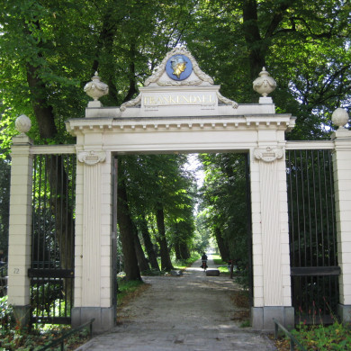 Hek en vleugelstukken worden geflankeerd door houten pijlers met blokmotief. Ter bekroning van de pijlers aan de buitenzijden van de vleugelstukken een houten pijnappel op console. De pijlers ter weerszijden van het dubbele hek, die aan achter- en voorzijde van gecanneleerde pilasters met Ionische kapitelen zijn voorzien, schragen een kroonlijst met guttea, waarboven een sokkel met aan de uiteinden twee vaasvormige ornamentstukken. Centraal op de sokkel een klokvormige beëindiging met een stichtingssteen in hout met aan de voor(NO-)zijde in vergulde letters: "FRANKENDAEL" en aan de achterzijde: "MDCCLXXXIII" (1783). Boven de 'steen' een door guirlandes omlijst medaillon met portretbuste van Mercurius aan de voorzijde en met het wapen van de familie Gildemeester (een gebogen geharnaste mannenarm met gehandschoende hand met doodsbeen) aan de achterzijde. De pijlers van de poort, die een iconografische afgeleide van de triomfboog is, rusten op hardstenen platen.