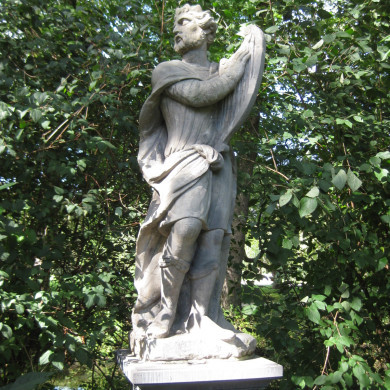 Hardstenen tuinbeeld uit ca. 1700, voorstellende Koning David met kroon en harp.