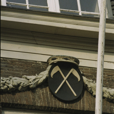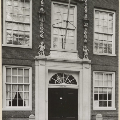 Pand met halsgevel (XVIIIa). Deuromlijsting en snijraam XIX A. Deur begin XIXc.