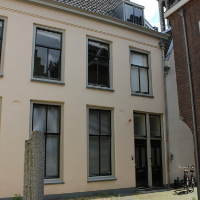 Een zeer ondiep 17e eeuws huis van twee bouwlagen, een kap evenwijdig aan de rooilijn van het Domplein en met een kleine kelder.