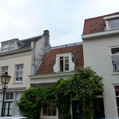 Van dit middeleeuwse stenen huis is het casco nog oorspronkelijk, slechts de voorgevel is jonger. De moerbalk ligt op peerkraalconsoles. Ook het eiken spant met krommers is nog aanwezig. In de linker zijgevel is nog een trapgevel te herkennen, mogelijk een 'gemene' muur. Het pand is vergelijkbaar met de middeleeuwse 'kameren'.