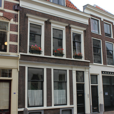 Een 17e eeuws huis van twee bouwlagen en een kap loodrecht op de straat.