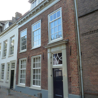 Een middeleeuws huis van twee lagen, een kap evenwijdig aan de straat, een kelder en een werfkelder.
