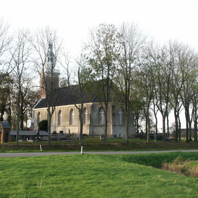 Herv.Kerk en toren. Waarschijnlijk in 1538 opgetrokken laatgotisch kerkgebouw met driezijdige door steunberen geschoord koor. Het muurwerk thans geheel gepleisterd. Toren in 1748 begonnen, in 1776 voltooid met open houten klokkekoepel.