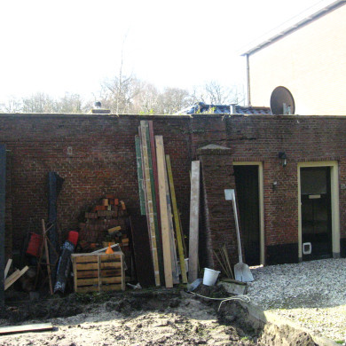 BAKSTENEN MOESTUINMUUR uit de 18e eeuw ten zuiden van het koetshuis annex koetsierswoning en paardestal, die aan de noordgrens van de voormalige moestuin is geplaatst en die ten behoeve van een optimale zonwerking iets naar achteren helt en aan de achter(noord-)zijde door bakstenen steunberen wordt gestut. De muur wordt door bakstenen pijlers geleed, die aan de voor-, achter- en bovenzijde van de muur iets uitsteken. De pijlers zijn aan de bovenzijde met hardstenen platen afgedekt.