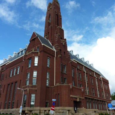 De voorgevel aan de Zuid-Hollandlaan is 17 vensterassen breed. Geheel links in een uitbouw is de hoofdingang met twee in Art Deco vormgegeven buitenlampen. Boven de ingang is een 56 meter hoge toren in opvallend siermetselwerk. De toren is geleed en in de uitvoering van deze geleding zijn onder meer Oosterse invloeden zichtbaar. Het teruggelegen brede middendeel van de voorgevel is 10 vensterassen breed. In het midden van de bovendorpels van de vensters op de begane grond zijn voluutconsoles geplaatst. Deze dragen een gesloten balkon over de gehele breedte van het middendeel. De rechthoekige vensters van de tweede en derde bouwlaag zijn twee aan twee tussen muurdammen geplaatst. In het verlengde van de muurdammen zijn in de nok van het zadeldak schoorstenen geplaatst. Het drie assen tellende, risalerende rechterdeel van de voorgevel heeft op de begane grond een driezijdig gemetselde erkerbouw.