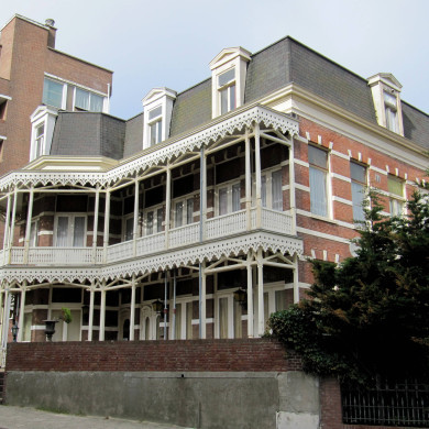 Het acht traveeën brede pension telt twee bouwlagen en heeft een zolderverdieping in een met shingles gedekt afgeknot schilddak. In de kap zijn drie dakkapellen met frontonbekroningen. De gevels zijn in schoon metselwerk opgetrokken met gepleisterde sierbanden en worden afgesloten door een geprofileerde gecorniste houten kroonlijst. Aan de voorzijde is het linker deel driezijdig naar voren uitgebouwd. Over de volle breedte van de voorgevel is op de parterre en de eerste verdieping een open houten veranda in de trant van de chaletstijl. De dragers van de veranda's zijn houten pijlertjes. De lijsten van beide veranda's zijn versierd met rijk gesneden ornamenten. De borstwering van de veranda op de eerste verdieping is van hout en opengewerkt.
