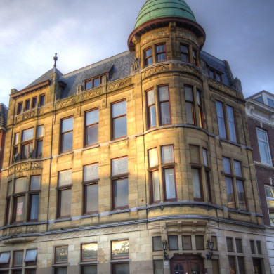 Bankgebouw op onregelmatige plattegrond uit 1909 in de stijl van de "Um Achtzehnhundert Bewegung' naar ontwerp van architect J.C. Dorsser op de hoek van Prins Hendrikplein en Prins Hendrikstraat.