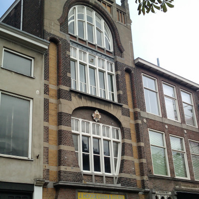 Pakhuis, gebouwd in 1901 voor de firma in verwarming en sanitair J. Hoogeveen en Co., naar ontwerp van W.B. van Liefland in de stijl van de Weense Sezession.
