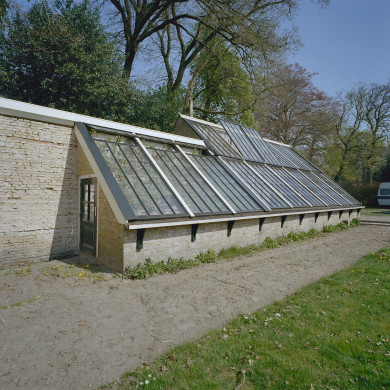 BAKSTENEN MUUR MET DRUIVENKAS. Deels gele en deels rode bakstenen muur in de NW-hoek van de overtuin met aan de NO-zijde een in gele baksteen opgetrokken druivenkas gedekt met een dubbele rij glazen. De achtermuur van de kas, die uit het begin van de 19e of wellicht uit de 18e eeuw dateert, bevindt zich aan de noordzijde; de toegangsdeur is aan de korte oostzijde gesitueerd. De kas gaat aan de westzijde over in een bakstenen muur, die in een flauwe en twee scherpe hoeken en in ruime curven in zuidelijke richting voert. De muur is deels bepleisterd en van een deels bepleisterde ezelsrug voorzien.