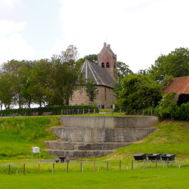 Op hoge terp landelijk nog grotendeels uit tufsteen bestaand kerkje van hoge ouderdom, gesloten door ronde koorsluiting; toren uit 1717.