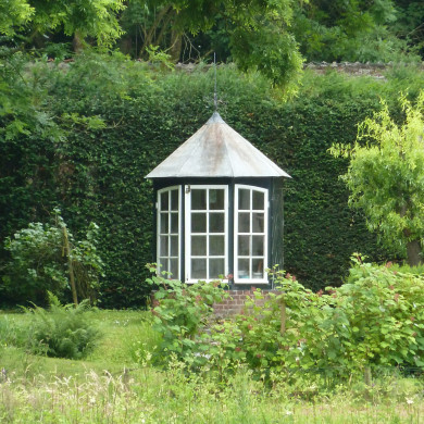 WESTELIJKE VOLIERE. Achtzijdige houten 19e-eeuwse voliere onder achtzijdig puntdak (met zink gedekt). De drie naar de voor(oost-)kant gerichte zijden zijn open. De voliere is in dezelfde tijd als de even meer in oostelijke richting geplaatste voliere tot stand gekomen en is waarschijnlijk door dezelfde maker gebouwd.